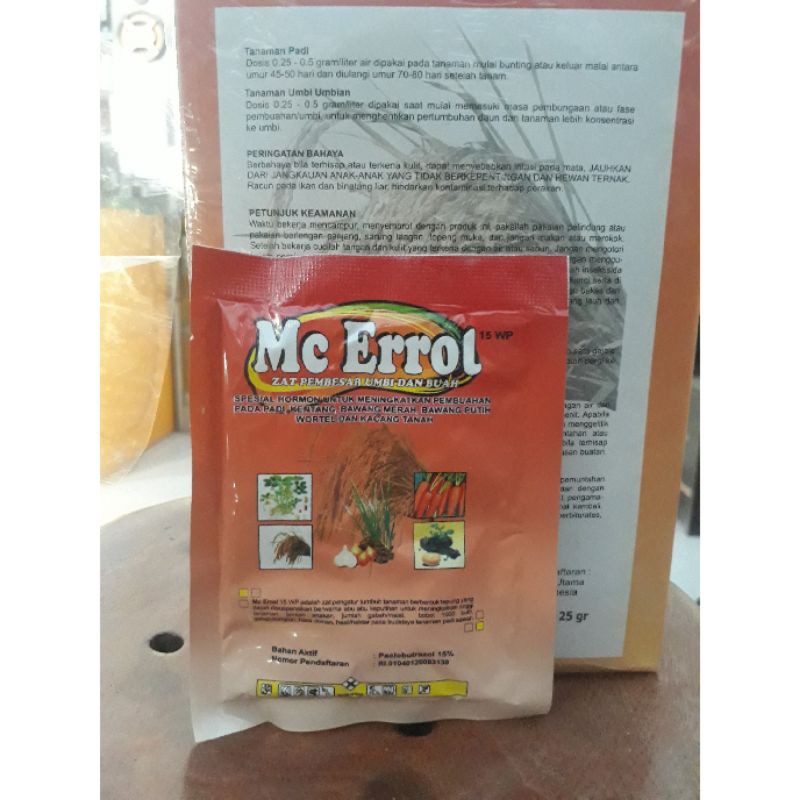 Bahan aktif : paclobutrazol 15% spesial hormon untuk meningkatkan pembuahan pada padi, kentang, bawang merah, bawang putih, wortel, kacang tanah, dll Mc errol 15 wp adalah zat pengatur tumbuh tanaman berbentuk tepung yang dapat disuspensikan berwarna abu-abu keputihan untuk meningkatkan tinggi tanaman, jumlah anakan, jumlah gabah/malai, bobot 1000 butir, gabah/rumpun, hasil ubinan, hasil/hektar pada bididaya tanaman padi sawah1 KOTAK ISI 20