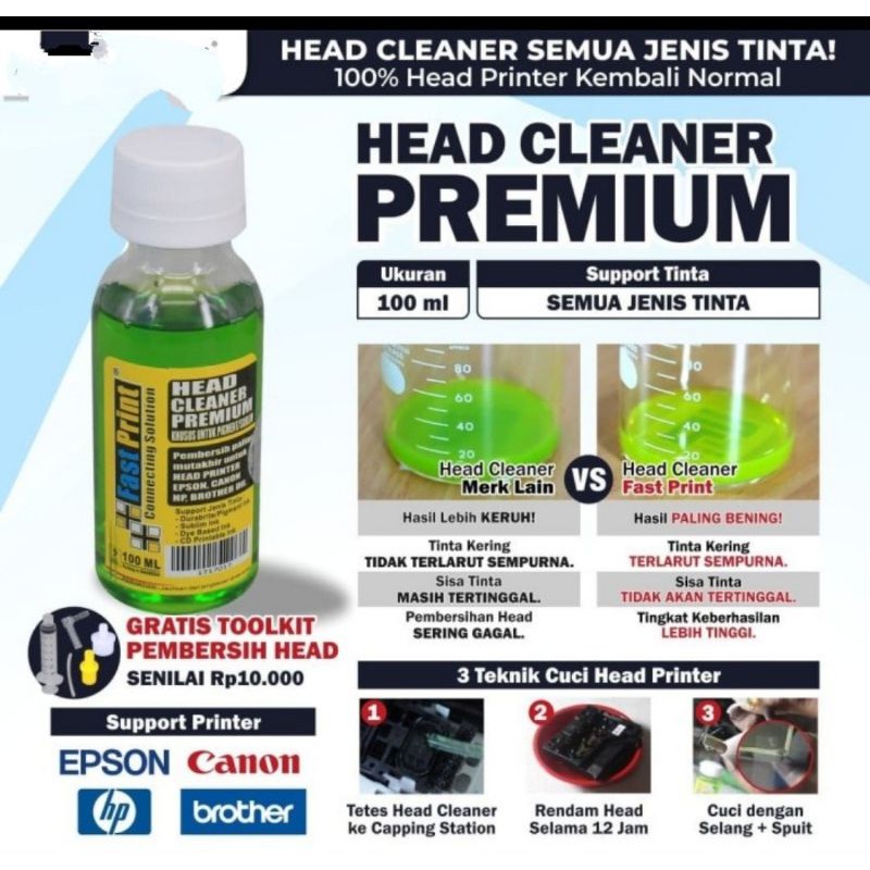 Head cleaner cleaning Printer Premium 100ml epson canon hp brother universal#314. S/Z # 150 Gram Rp .139.900GRATIS TOOLKIT PEMBERSIH HEAD SENILAI Rp. 10.000!!!(Bonus dikirim menyesuaikan ketersediaan stok)Spesifikasi: - Support Printer: Epson, Canon, HP, Brother- Suport ke jenis tinta: Tinta Dye Based, Anti UV, Tinta Original, Tinta Pigment Durabrite / Art Paper hingga Tinta Textile DTGTanda-tanda Head printer perlu dibersihkan:- Hasil print putus putus / bergaris.- Salah satu warna tidak keluar.- Hasil nozzle tidak maksimal.Keunggulan Head Cleaner Premium Fast Print:- Dapat digunakan untuk Print Head Epson, Canon, HP dan Brother.- Tingkat keberhasilan cuci Head Printer LEBIH TINGGI daripada MERK LAIN.- Dijamin TIDAK MEMBUAT IRITASI kulit Anda.- PRAKTIS dan EKONOMIS, Head yang rusak dapat digunakan kembali tanpa perlu ganti atau ke Service Center.- Disertai petunjuk penggunaan sehingga proses pencucian head dapat dilakukan oleh siapa saja.- BONUS Toolkit Pembersih Head (Spuit + Sela