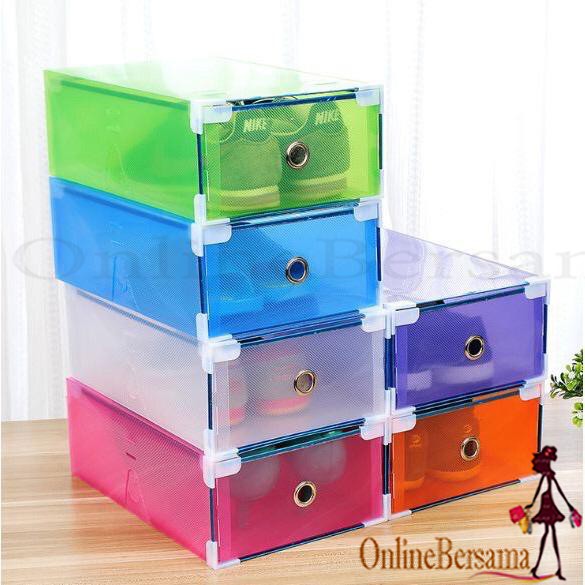 Harga untuk 1 boxKokoh dengan 5 warna eleganDapat ditumpuk beberapa boxes.Kuat saat ditumpuk karena ada pengait antar box.Ada ring dan sudut plastik, membuat kotak sepatu lebih kuat dan elegan.Koleksi sepatu anda berantakan? Susah menemukan sepatu yang hendak dipakai? Atau debu & kotoran merusak sepatu anda. Kotak Sepatu transparan ini merupakan solusi terkini.Silver Frame Transparent Shoe Box Organisir koleksi sepatumu dengan baik dan bisa juga sebagai laci untuk simpan barang kamu yang lain agar lebih rapi sangat ringan dan bisa ditempatkan di mana saja yang penting gampang kamu jangkau. Warna transparan, memudakan melihat isi box. Ketika digunakan, bisa ditumpuk buat jadi media penyimpan yang membuat rumah lebih rapi. Ketika tidak digunakan, bisa dilipat agar bisa disimpan dengan mudah dan tidak sempitin lemari. Mudah untuk dibentuk, tidak memerlukan alatFungsi kotak sepatu transparan sbb:Merapikan lemari sepatu Anda.Memudahkan memilih sepatu yang ingin Anda pakai.Dapat dilipat kembali jika tidak terpakai, sehingga menghemat tempat.Menghindari sepatu dari debu dan kotoran, serta lubang ventilasi agar sepatu tidak lembab.Spesifikasi:Bahan : SOLID PPWarna : transparan mixed biru, hijau, kuning, ungu dan pink.Model : SLIDE / LACI, dilengkapi metal list, ring dan sudut plastik.Size: 30 x 18 x 10cm. Tebal: 0.6mm outer dan 0.55mm innerNote : 1 kg muat 5 pcs.KOKOH, dapat ditumpuk, kuat karena ada pengait antar
