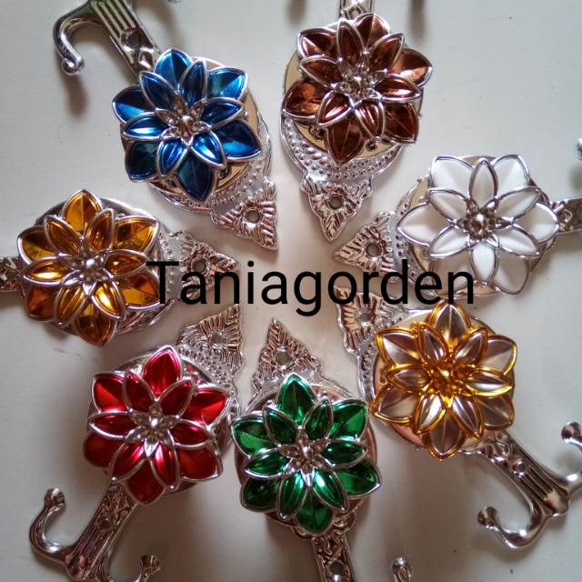 Hook bung Terbuat dari almunium Bunga nya tebuat dari pelastik Harga tertera harga 1pcs hook bukan satu pasang Sudah termasuk skrupnya.Tersedia warna Gool BiruMerah Hijaw silver Putih Coklat Kegunaan untuk mengaitkan tali / tassel atawa tali ikat senada/b