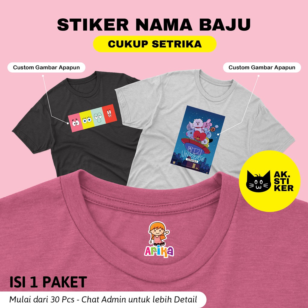 Stiker Baju Iron-On - AK.STIKERBiar ga tertukar sama punya orang lain, sekarang baju kk bisa ditempelin stiker iron on dari AK.STIKER loh...Cara pasangnya gampang, cukup disetrika aja~~ 1 Paket isinya mulai dari 30 Pcs~ Bisa Custom Karakter~ Bisa Tanpa Karakter, atau..~ Bisa Custom Gambar apapun tanpa tulisan nama (gambar BTS, gambar Blackpink, Gambar Kartun dll)~ PO, lama pengerjaan 2-6 Hari Kerja (Tanggal merah tidak dihitung yaa)# FORMAT PEMESANAN (TULIS DI NOTE/CHAT)No. / Jenis Variasi / 1 Nama / 1~2 Kode karakter / 1 Kode font / 1 Warna fontCONTOH: 1. Variasi Bawah Rounded / Nelson / Pic-32 / F-15 / Merah2. Variasi Tanpa karakter / Amelia / - / F-23 / Ungu3. Variasi Custom karakter - Bawah Rounded / Bunga / custom gambar di chat / F-1 / Pink# Disclaimer1. Harap ikuti instruksi cara pemakaian2. Harap ikuti instruksi cara perawatan3. Stiker tetap bisa rusak (tak ada yang abadi )4. Keterlambatan/kerusakan/kehilangan oleh pihak kurir ekspedisi di luar tanggung jawab kami sebagai SellerTerimakasih telah membaca deskripsinya ☺️Bisa langsung chat admin ya jika ada pertanyaanSelamat berbelanja~!AK.STIKER