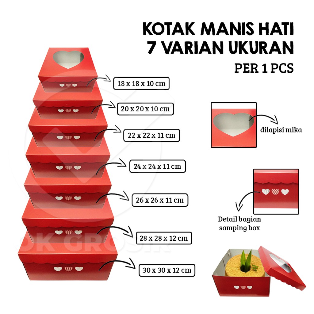 Kotak Manis Hati / Dus Manis Hati 7 Varian Ukuran [ Per 1 Pcs ]Informasi Produk : - Kotak dus berwarna merah- Dibagian atas dus dilapisi mika transparan bentuk hati- Bahan karton tebalVariasi Ukuran : - 18 x 18 x 10 cm (MH18)- 20 x 20 x 10 cm (MH20)- 22 x 22 x 11 cm (MH22)- 24 x 24 x 11 cm (MH24)- 26 x 26 x 11 cm (MH26)- 28 x 28 x 12 cm (MH28)- 30 x 30 x 12 cm (MH30)Cocok untuk wadah kue tart, kue chiffon, dll. #kotakdus #kotakmanishati #kotakhati #duskue #kotakkue #box #boxcake #merahhati #okg